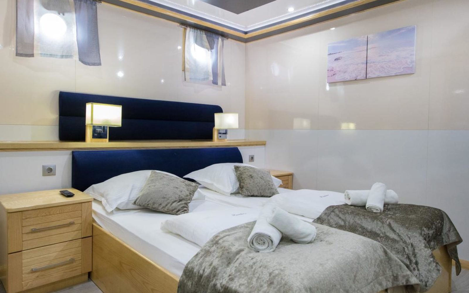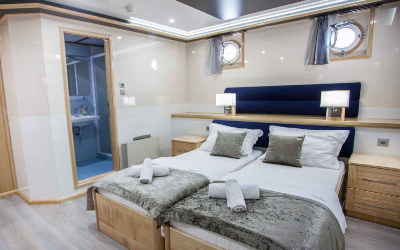 Ces cabines sont équipées de, soit un lit double, soit deux lits jumeaux. Celles situées sur le pont principal ont des fenêtres donnant vue sur mer, tandis que celles du pont inférieur ont des hublots.