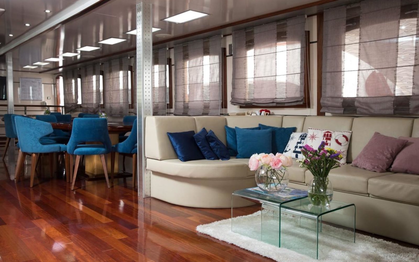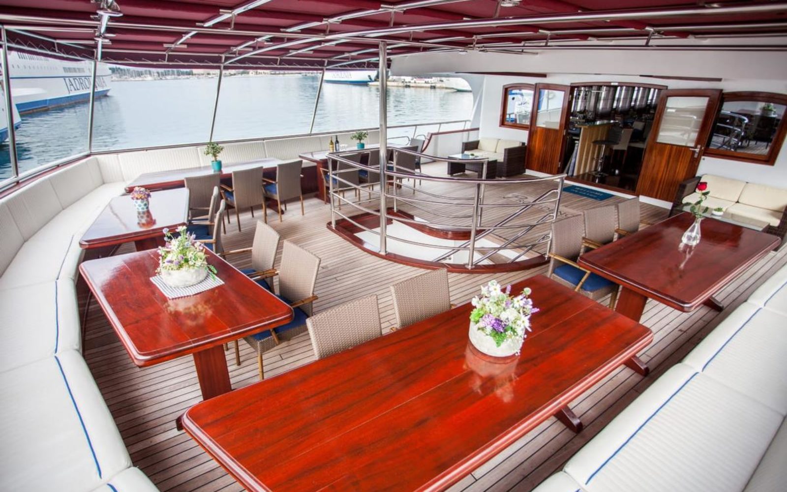 Plusieurs espaces communs sont à votre disposition : pont solarium avec transats, jacuzzi, salon plein air situé sur le pont supérieur et un bar-restaurant élégant qui peut asseoir tous les passagers lors des repas.