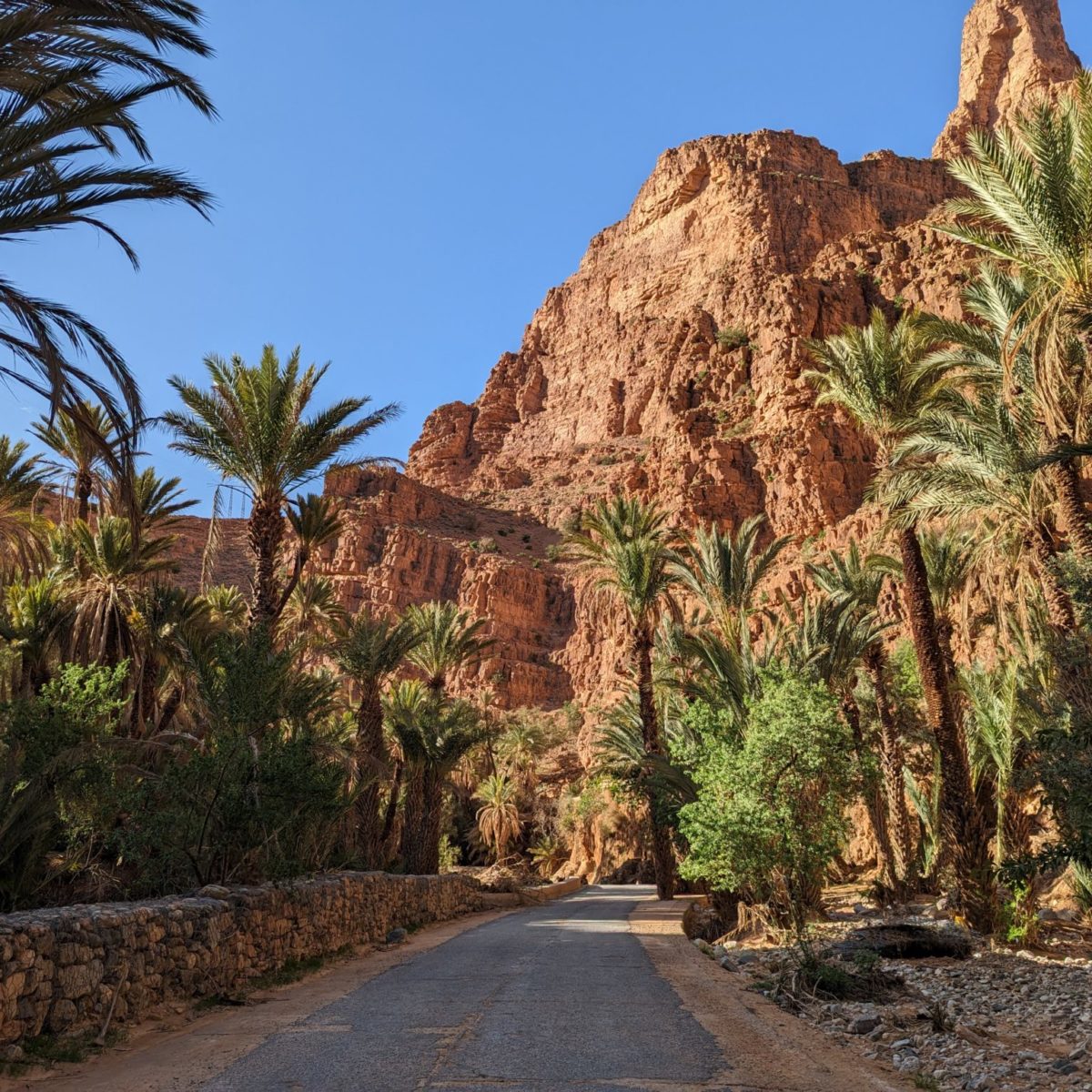 Nous continuons maintenant sous les palmiers. Nous croisons quelques villageois qui, selon la saison, sont en train de cueillir les dattes ou les oliviers. Cet endroit est peu habité, il est agréable de se balader sur ces sentiers traversant la palmeraie. Certains passages sont ombragés par les feuilles, tandis que d’autres sont plus ensoleillés. Nous déjeunons dans un agréable gîte donnant vue sur les gorges. « L’Haj » nous reçoit, c’est notre hôte et c’est ainsi qu’il se fait appeler. Un sacré personnage à ne pas rater! La cuisine est locale et délicieuse, et l’ambiance est comme à la maison.