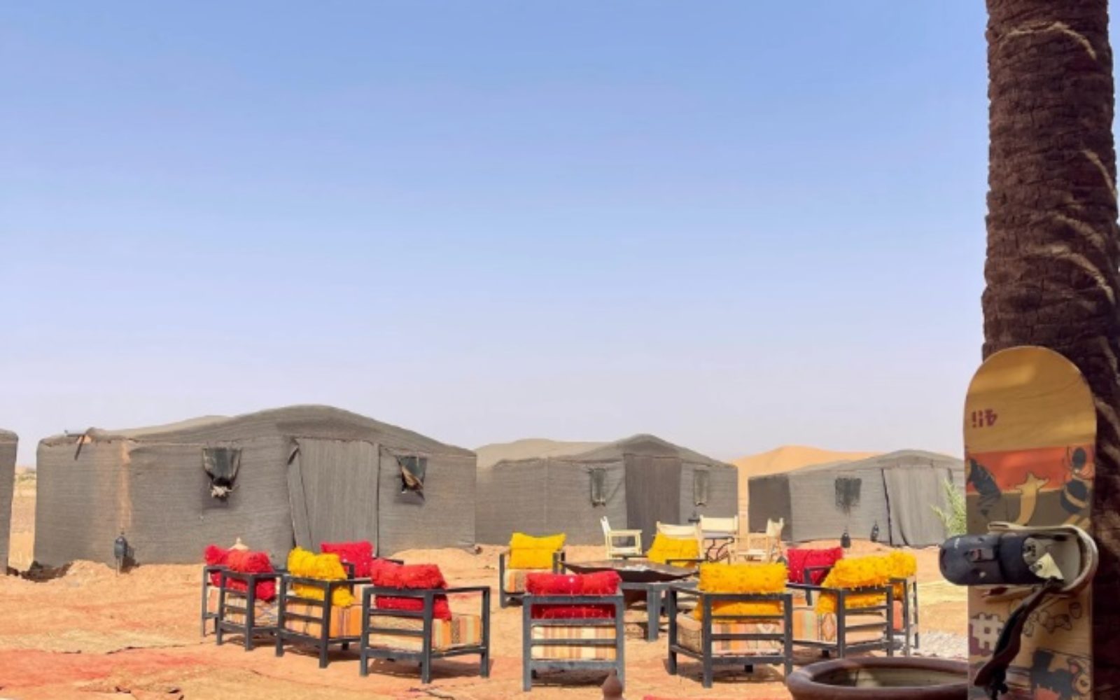 Au cœur du désert de M’hamid se dresse le camp. Dès l’arrivée, l’ambiance entre les dunes aux couleurs ocres donne la sensation d’être seul au monde.